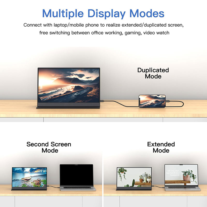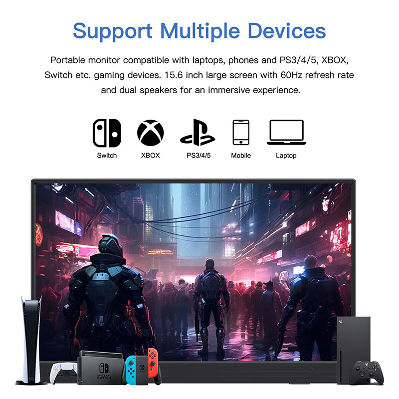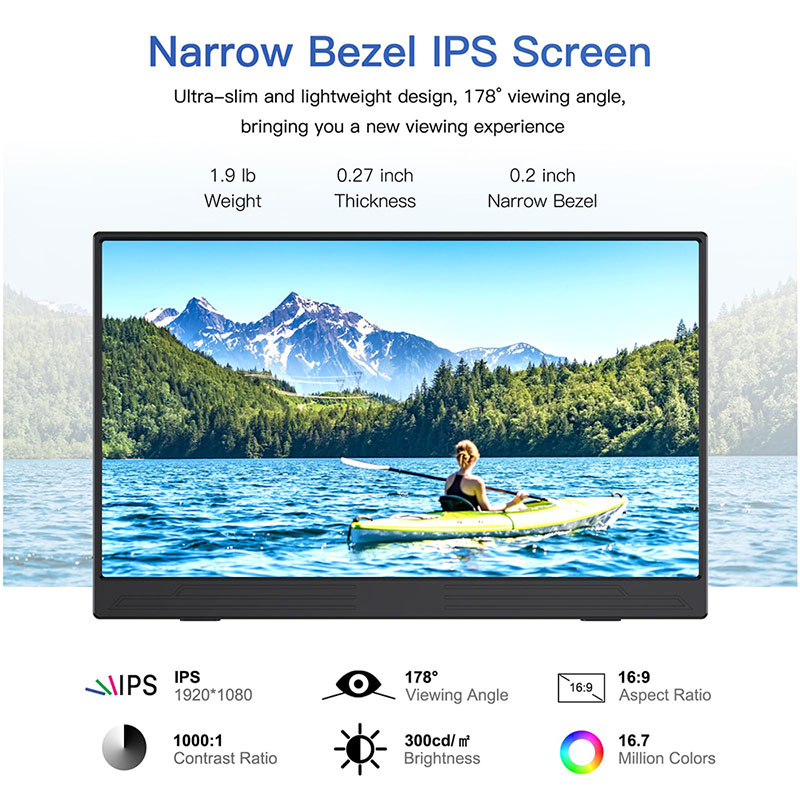 نقدم لكم شاشتنا المحمولة مقاس 15.6 بوصة عالية الدقة بالكامل، وهي حل عرض متميز يقدم صورًا فائقة الجودة. بفضل دقة الوضوح العالي الكامل ولوحة IPS ونسبة العرض إلى الارتفاع 16:9، فإنها توفر صورًا حادة ونابضة بالحياة مع زوايا مشاهدة واسعة. تتميز الشاشة بسطوع 300cd/㎡، ومعدل تحديث 60 هرتز، ونسبة تباين 1000:1 لتجربة غامرة.